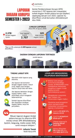 Komisi Pemberantasan Korupsi (KPK) menerima 2.707 laporan dari masyarakat terkait dugaan tindak pidana korupsi (tipikor) sepanjang Januari-Juni 2023. Laporan itu diverifikasi untuk kemudian ditindaklanjuti atau tidak.