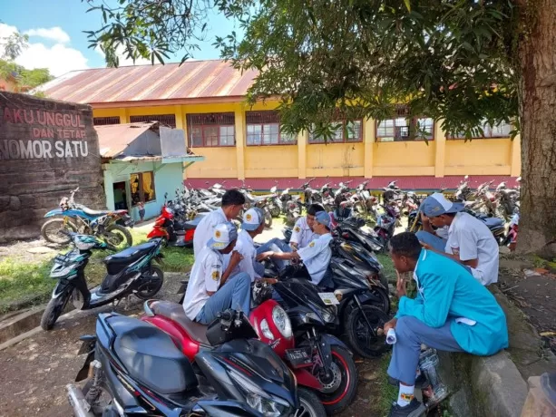 Sejumlah pelajar  yang duduk santai di halaman parkir  SMAN 1 Jayapura Senin (11/9). (Karel/Ceposonline.com)