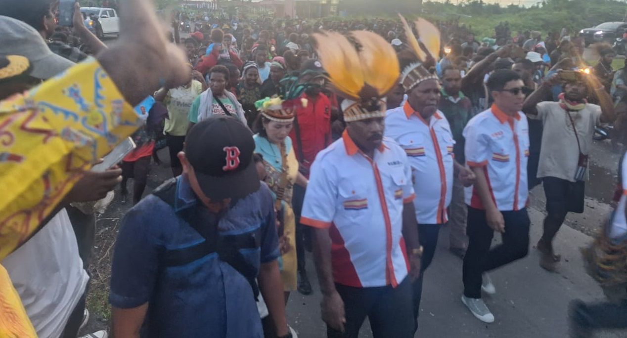 Bacakada Bupati Nduga Named diantar masa pendukungnya menuju Kantor KPU Nduga untuk mendaftar, Kamis (29/8) (TIM NAMED)
